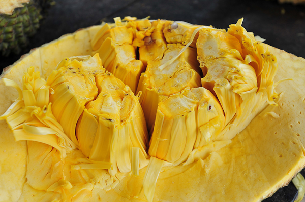 Mít chín tự nhiên sẽ có những đặc điểm như gai nở to, màu xanh vàng, xam xám và chín đều từ cuống cho đến đít quả.
